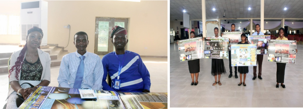 The UN-ARCSSTE-E SEOP Team at the Exhibition Booth (left) and Group Photo of Students of Mountain Top University displaying Space Education Series Educational Posters given to them by UN-ARCSSTE-E at the event (right).